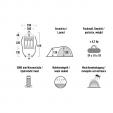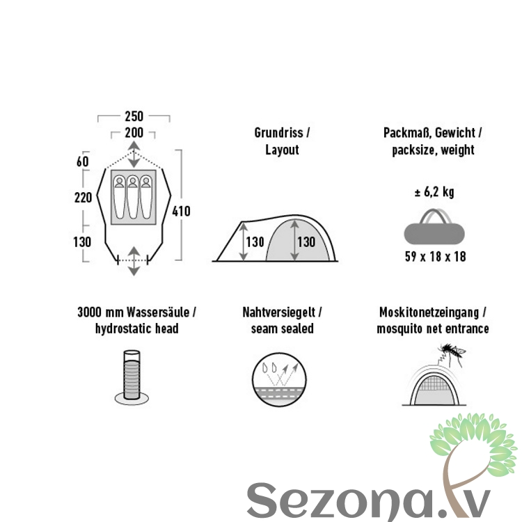 Četrvietīga kupolveida telts ar lielu nodalījumu ekipējumam, divām ventilācijas lūkām un durvīs iestrādātu moskītu tīklu.