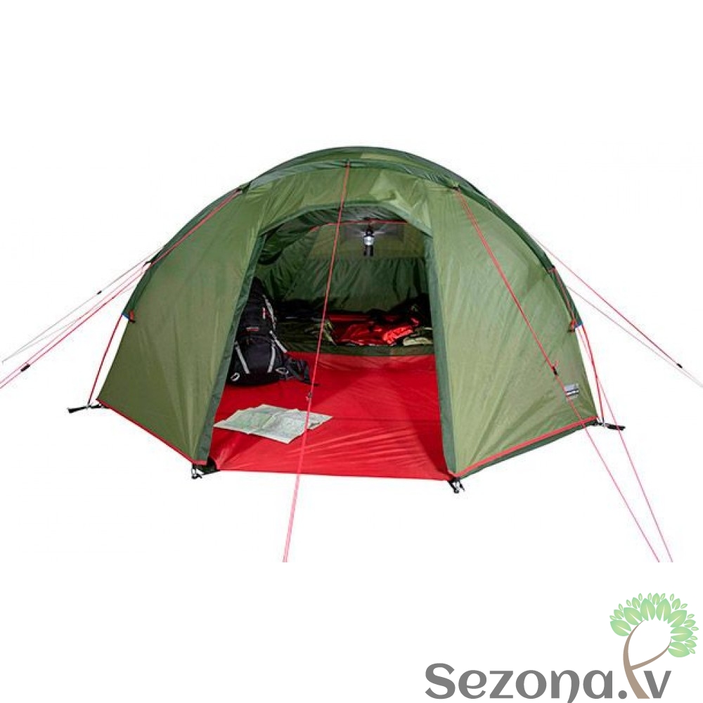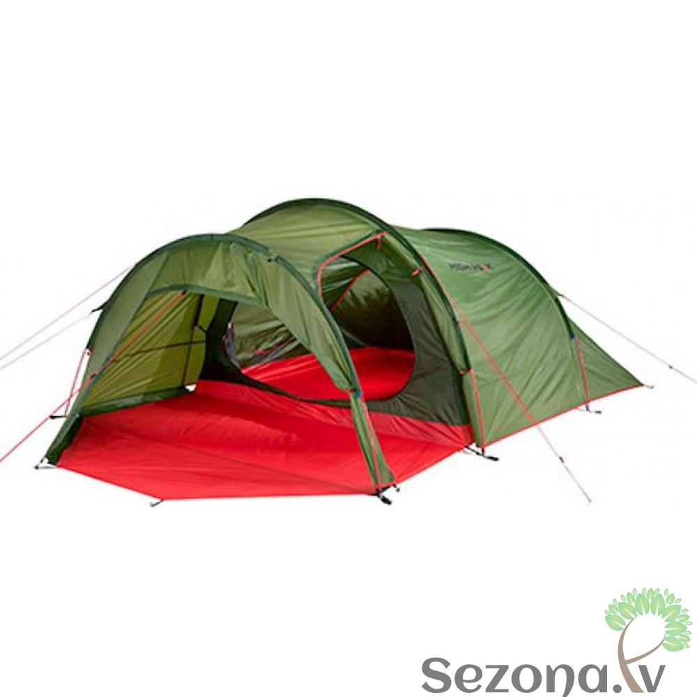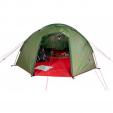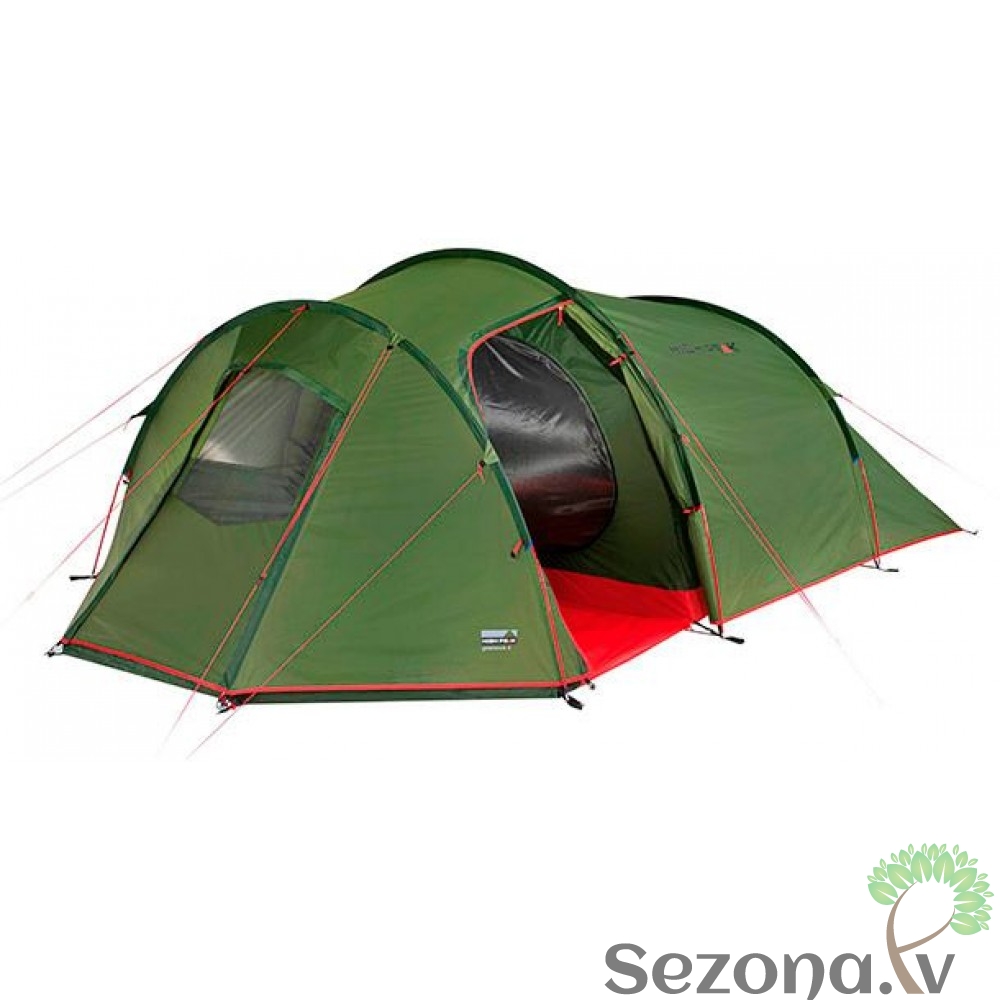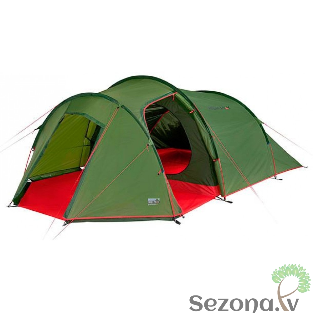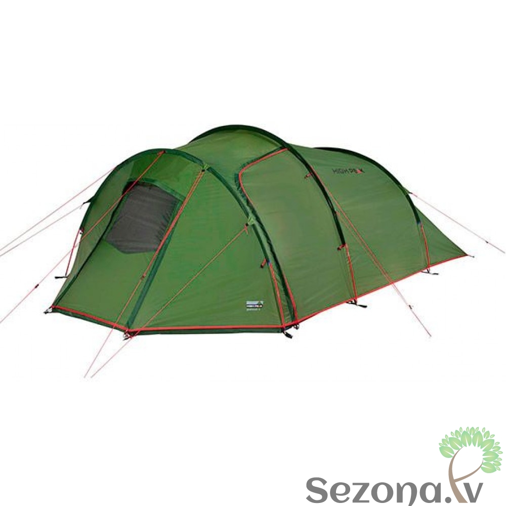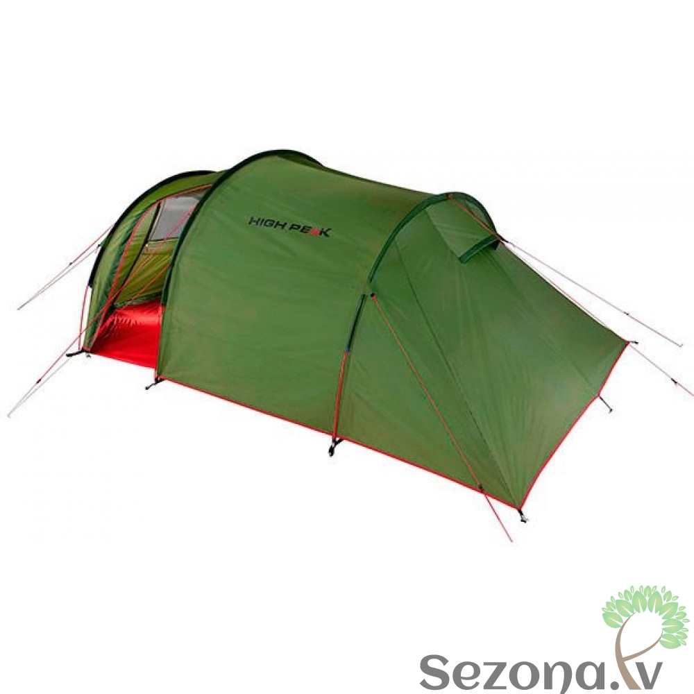 Klasiska High Peak tuneļveida telts četrām personām. Ar moskītu tīklu un nošūtām dubultām vīlēm.