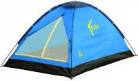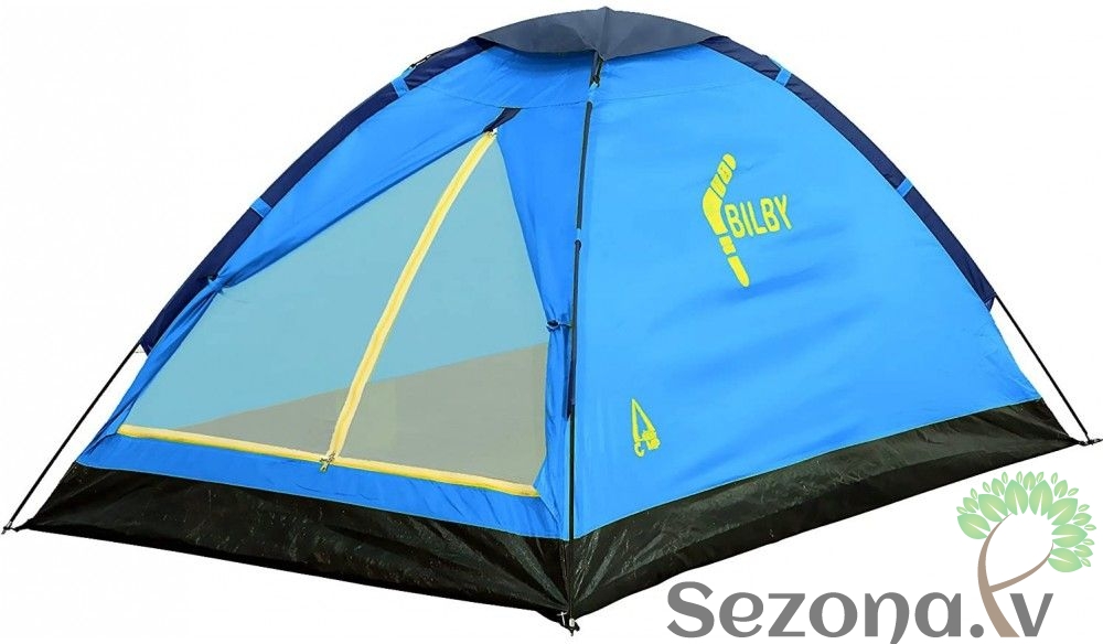 Divvietīga kupolveida telts ar vienu ventilācijas lūku un durvīs iestrādātu moskītu tīklu.