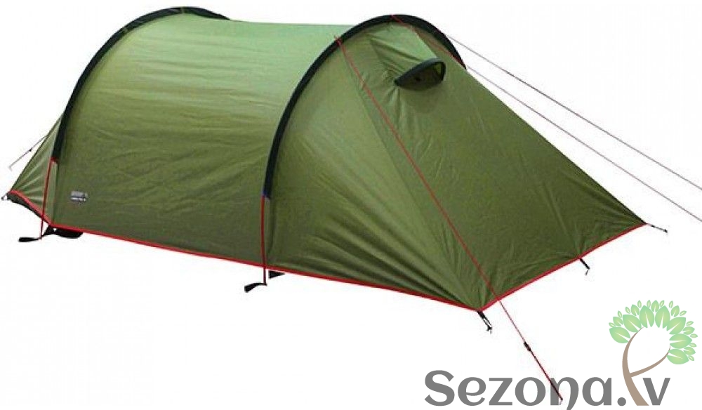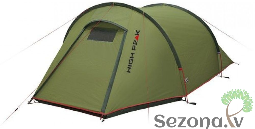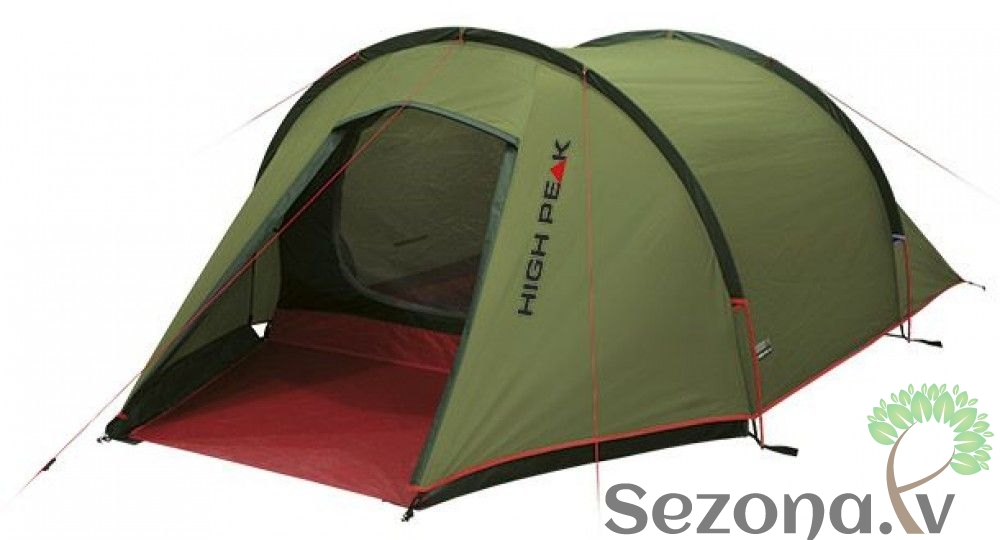 Klasiska High Peak tuneļveida telts trim personām. Ar moskītu tīklu un nošūtām dubultām vīlēm.