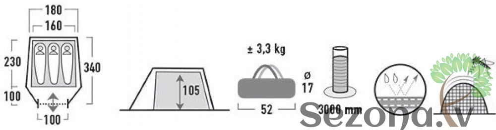 * Iekšējā telts no 100% poliestera; elpojošs.