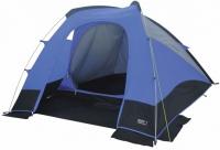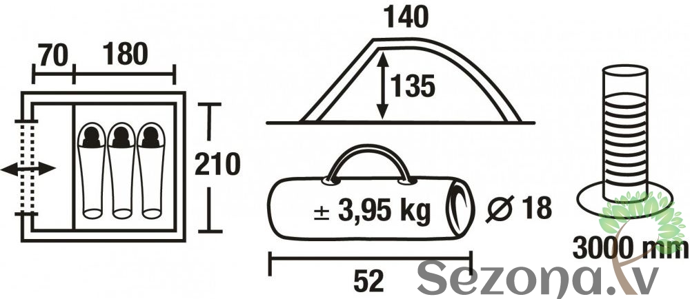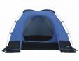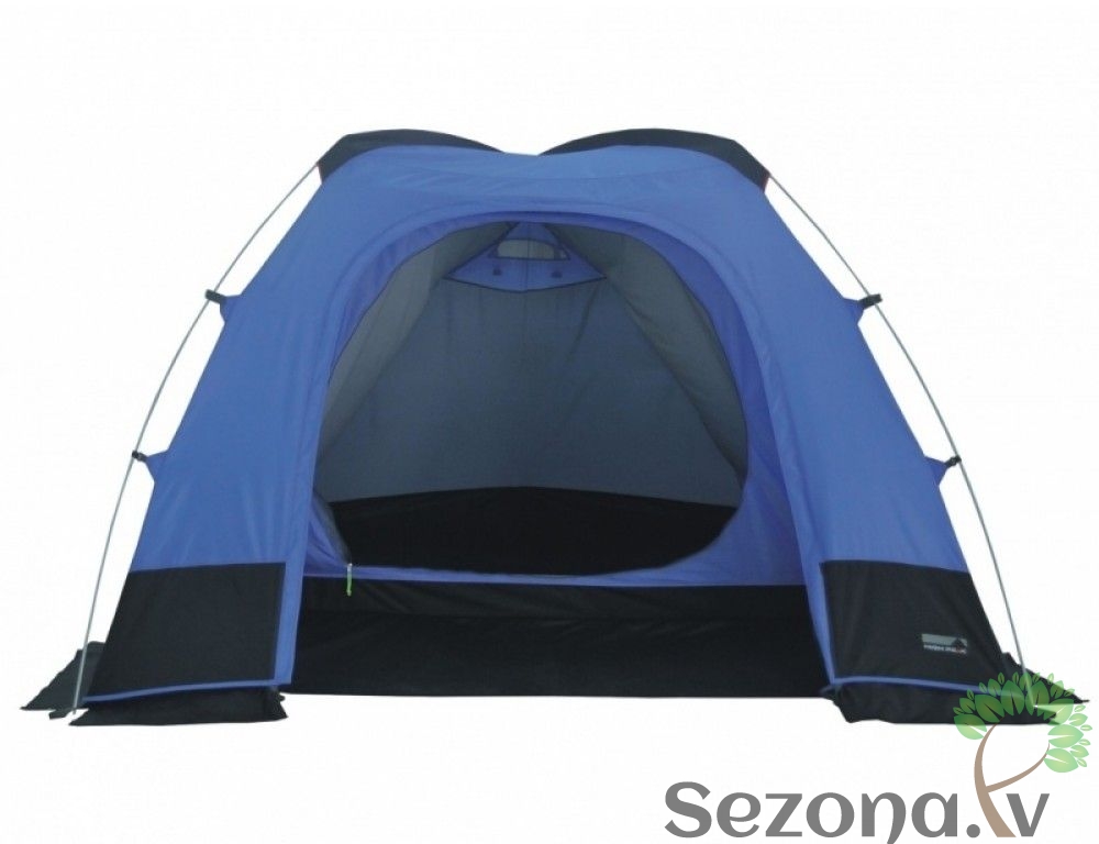 Trīsvietīga kupolveida telts ar nodalījumu ekipējumam, vienu ventilācijas lūku un durvīs iestrādātu moskītu tīklu.