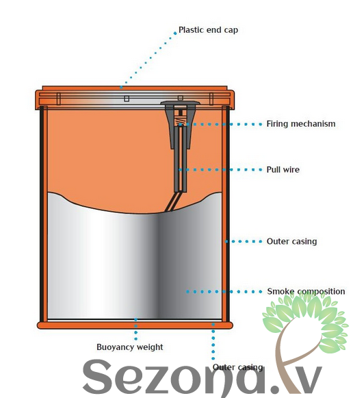 - Nekavējoties pārmetiet pāri bortam dūmu signālsveci. Dūmi parādīsies pēc 2 sek. aiztures