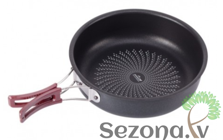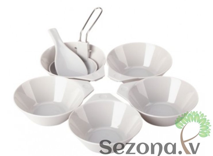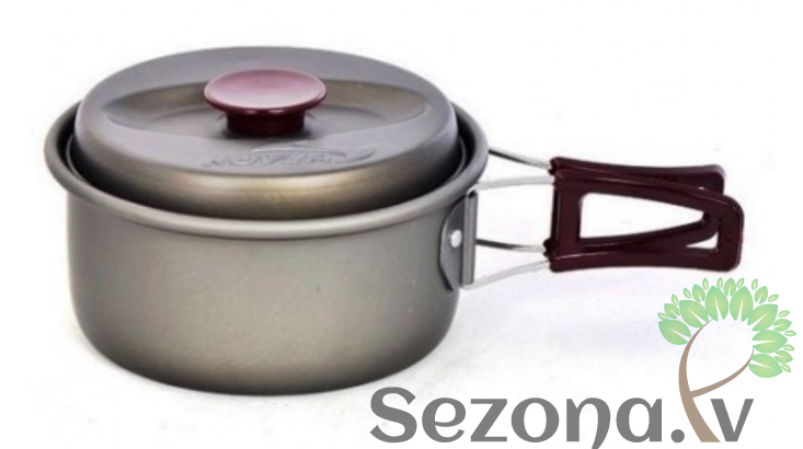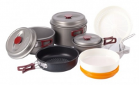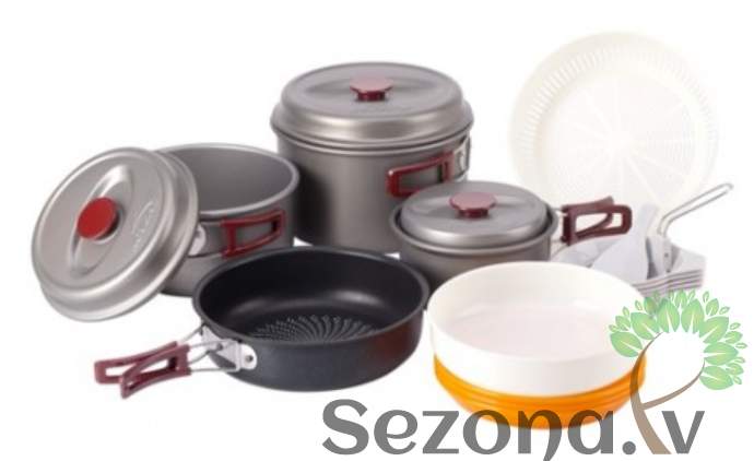 Ērts kempinga katlu un trauku komplekts piecām personām. Katli ir izgatavoti no anodizēta alumīnija, pateicoties kuram ēdiena gatavošana ir ērtāka un ātrāka. Pannai ir speciāls teflona pārklājums, pie kura nekas nelīp klāt. Viss komplekts sapakojās nelielā somiņā ar rokturīti.