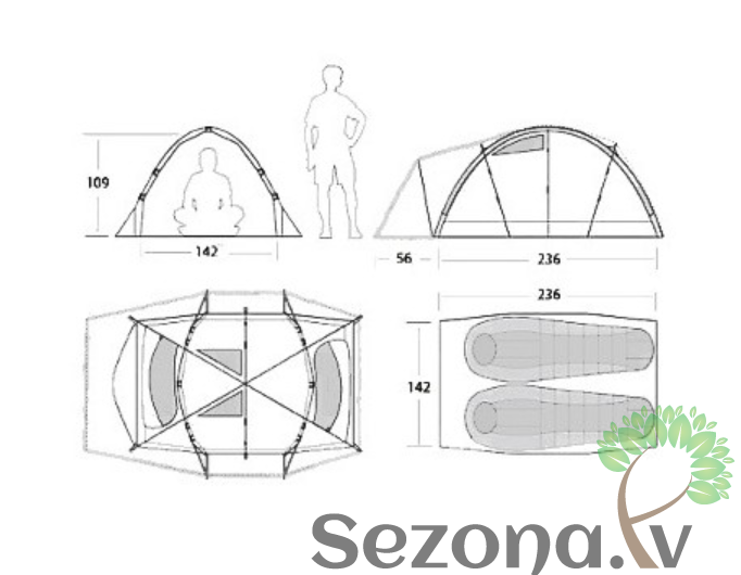 Telts izmēri: 109 x 142 x 236cm