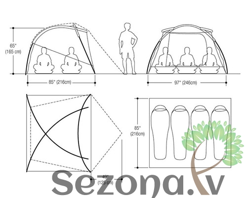 Telts izmēri: 156cm x 216cm x 246cm