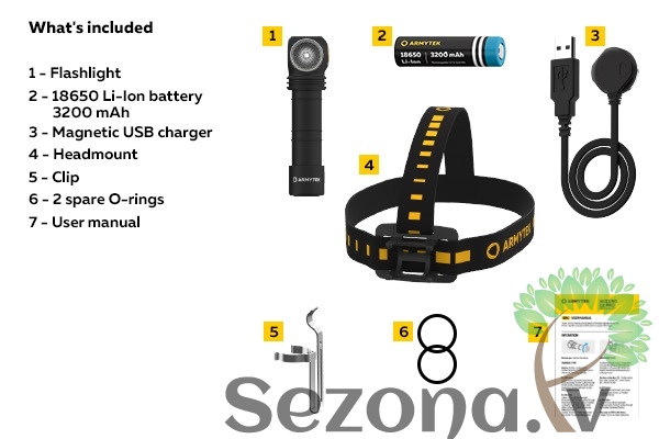 The brightness of this model reaches 1200 lumens at a distance of up to 108 meters. The 18650 Li-Ion 3200 mAh battery is charged inside the flashlight using a special magnetic USB cable. The universal Wizard C2 has several fixing options: on metal surfaces thanks to a magnet in the tailcap, on clothes, belt or bag using a clip, on the head with a comfortable headmount.