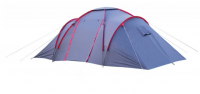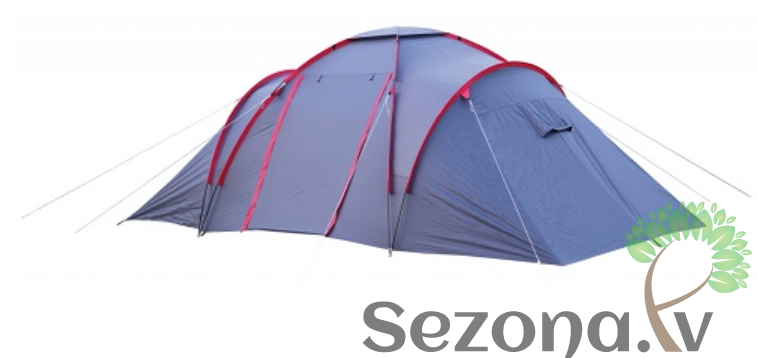 Sešvietīga kempinga telts ar plašu vestibilu un divām atsevišķām telpām gulēšanai.