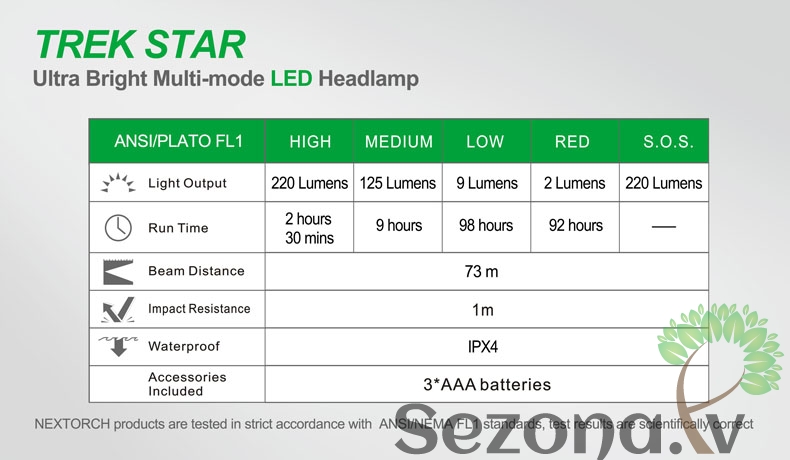 Šis LED lukturis ar 5 dažādiem apgaismojuma režīmiem un līdz 220 lumeniem ir īpaši izstrādāts pārgājieniem, alpīnismam, kempingam, makšķerēšanai un citām ikdienas aktivitātēm. Lukturis sver uz pusi mazāk salīdzinājumā ar citiem standarta pieres lukturiem un piedāvā piecus dažādus apgaismojuma režīmus (Max / Normal / Low / Red / SOS). Pateicoties viedajai atmiņai, TrekStar automātiski iegaumē biežak lietoto apgaismojuma režīmu. TrekStar LED lukturis ir ideāla izvēle kempingam, trekingam vai rūpnieciskai izmantošanai. Pateicoties IPX4 standartam, tā korpuss ir pilnībā mitrumizturīgs. Viszemākajā apgaismojumā TrekStar ir ideāli piemērots maigai lasīšanai tumsā, nepārslogojot acis.