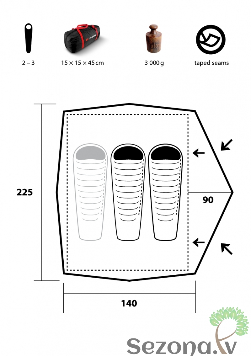 - Iekšējās telts materiāls: permeable WR 100 % PES